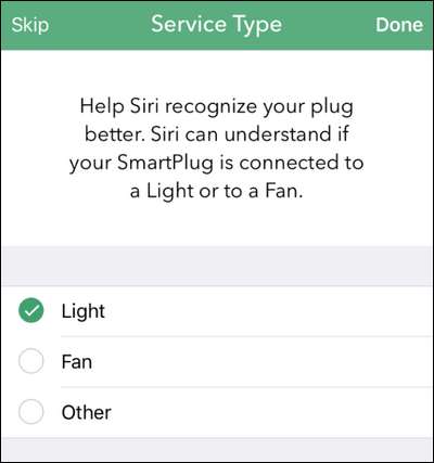 Ten slotte zal de iHome-app u vragen om het type apparaat te identificeren dat het is: een lamp, een ventilator of "ander" voor elk ander elektrisch apparaat. Deze stap is niet bijzonder kritisch, maar het helpt wel om de manier waarop Siri uw verzoeken begrijpt te verbeteren. Als Siri bijvoorbeeld weet dat de stekker een lamp in je slaapkamer bedient, dan reageert ze op het commando “doe de slaapkamerverlichting uit”.
