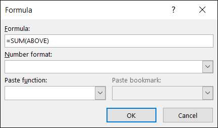 U kunt standaard een veelgebruikte formule voor u zien. Tussen haakjes, heb je het positionele argument dat erkend wordt. In ons geval is Outlook gelooft dat we alle cellen hierboven willen bedragen.