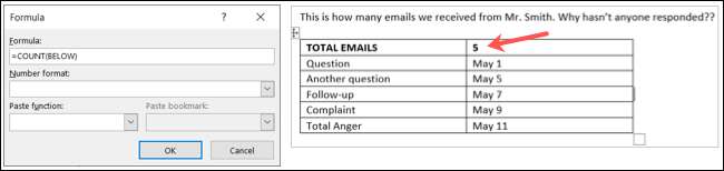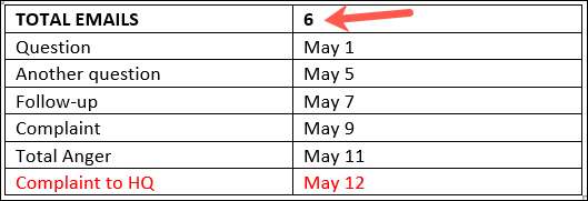 Voor dit volgende voorbeeld tellen we het aantal e-mails dat we van een klant hebben ontvangen. We gaan dus tellen (hieronder) en klik op "OK." En we hebben ons resultaat.