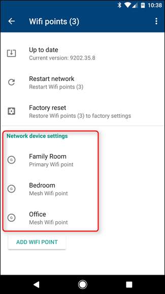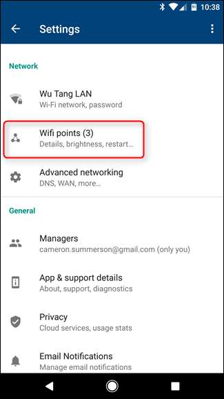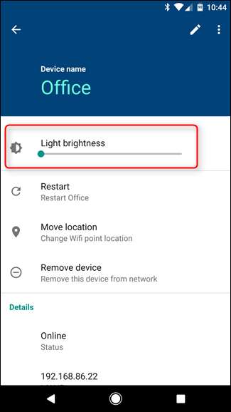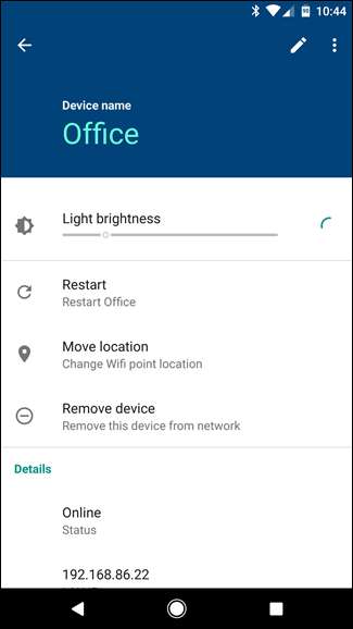 Dat klopt, hier is geen elektrische tape nodig —Google Wifi heeft eigenlijk een functie waarmee je de lichten uit de app kunt doen. Als je meerdere wifi-eenheden in huis hebt, kun je ze allemaal afzonderlijk bedienen, wat een leuke bijkomstigheid is van Google. Op die manier kunt u het licht op het apparaat in gevoelige gebieden zoals de slaapkamer volledig uitschakelen en desgewenst de helderheid in de woonkamer verhogen.