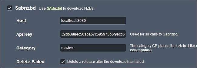 In de Downloaders sectie, je moet ofwel 1) CouchPotato instellen om te communiceren met SABnzbd of 2) een bewaakte map specificeren voor je torrent-bestanden om het met Deluge te laten werken. We zijn het aan het opzetten om met SABnzbd te werken: ga je gang en laat de host met rust en voer je SABnzbd API-sleutel in (dezelfde die je gebruikte voor SickBeard).