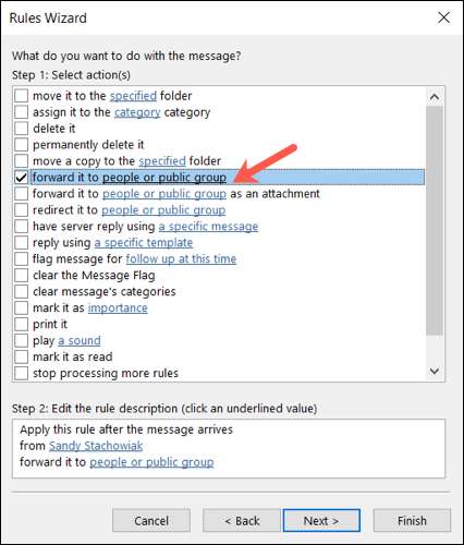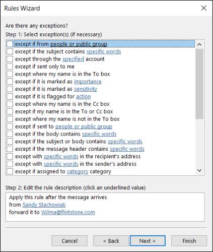 Terug in het venster Regelwizard op "Volgende" en vink de vakken aan voor de uitzonderingen die u wilt toevoegen, indien aanwezig. Klik volgende."