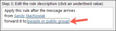 Controleer in de voorwaarde van de Regelwizard (stap 1), controleer het vakje voor verzonden naar [uw e-mailadres]. Dit past de regel toe op alle e-mails die naar dat adres zijn verzonden. Ga vervolgens verder met de rest van het regelinstellingenproces om de e-mails door te sturen.