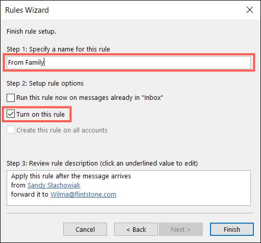 Geef uw regel een naam en vink vervolgens het vakje aan voor inschakelen van deze regel. Optioneel kunt u het selectievakje controleren om de regel onmiddellijk uit te voeren. Klik op "Finish" om uw regel op te slaan en in te schakelen.
