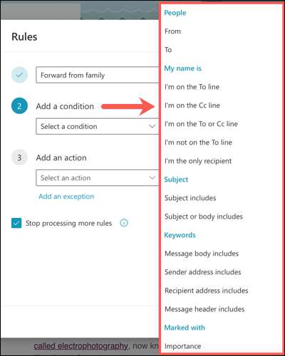 Klik vervolgens op het vervolgkeuzelijst om een voorwaarde te selecteren. U kunt criteria gebruiken, zoals wie de e-mail is van, hoe uw naam verschijnt, of wat de onderwerpregel of instantie bevat.