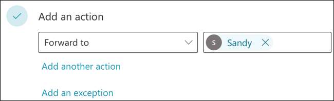 Voer het e-mailadres in dat u de e-mails wilt doorsturen naar in het vak dat verschijnt. Klik op de bijbehorende link om een andere actie op te nemen of een uitzondering toe te voegen.