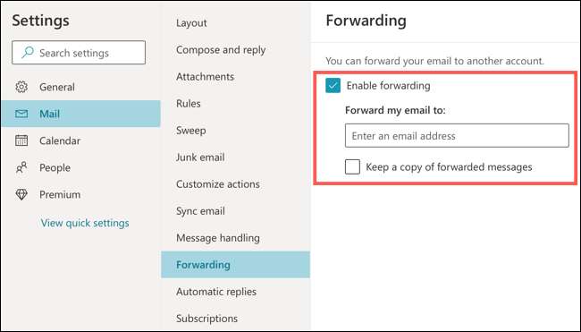 Als u Outlook voor het web gebruikt, kunt u een doorstuurregel maken, net als de desktopversie. Maar je zult het opzetten Doorsturen voor alle inkomende e-mails buiten het gebruik van een regel.