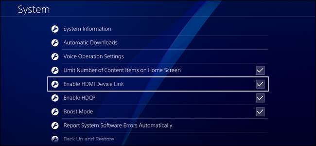 Zoek de optie "Enable HDMI Device Link" en zet deze aan. Er is geen andere informatie over deze instelling beschikbaar op het systeem, dus het is een beetje dubbelzinnig, maar dit is eigenlijk wat Sony HDMI-CEC noemt op de PlayStation 4.