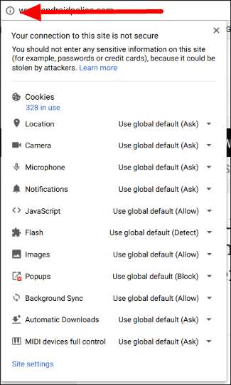 Met de betreffende website open, klikt u op het kleine "i" -cirkel helemaal links in de adresbalk. Op beveiligde websites staat hier eigenlijk "Veilig" in plaats van de "i" weer te geven - het werkt echter hetzelfde.