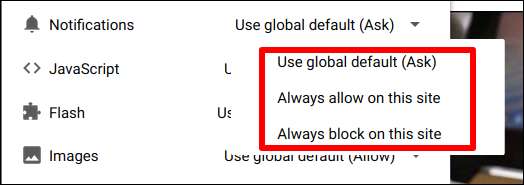 Als u alle meldingen van Chrome wilt dempen, doet u dit hier. Met deze instelling kunt u eenvoudig alle meldingen blokkeren, alle meldingen toestaan of ze allemaal opvragen.