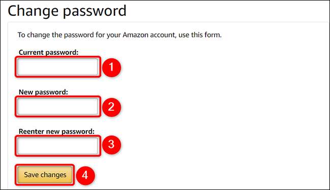 Je ziet een pagina 'Wachtwoord wijzigen'. Klik hier op het veld "Huidig wachtwoord" en typ uw huidige Amazon-accountwachtwoord. Klik vervolgens op het veld "Nieuw wachtwoord" en typ het nieuwe wachtwoord dat u voor uw account wilt gebruiken. Klik op het veld "REINTER NIEUW WACHTWOORD" en typ uw nieuwe wachtwoord opnieuw.