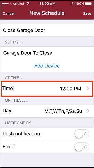 Tik vervolgens op "Tijd" om een tijd in te stellen waarop uw garagedeur automatisch sluit.