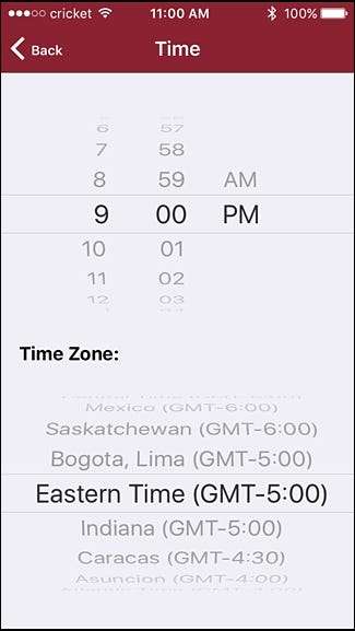 Selecteer een tijd en bevestig uw tijdzone onderaan. Druk op de terugknop in de linkerbovenhoek als je klaar bent.