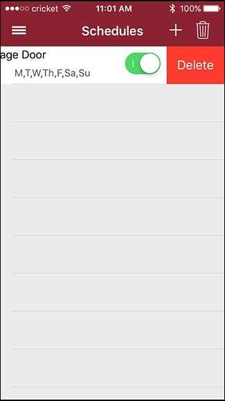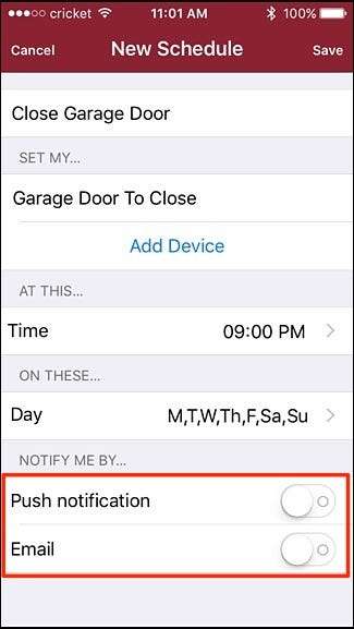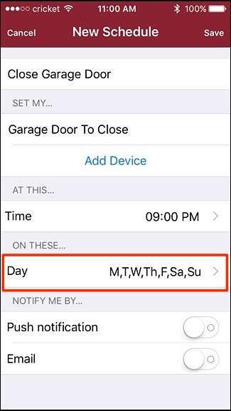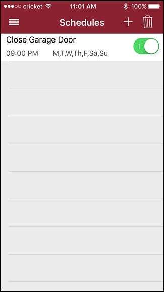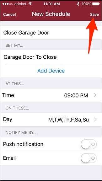 U kunt op dit schema vertrouwen en uw garagedeur 's nachts automatisch laten sluiten, of u kunt hem gewoon gebruiken als back-up voor het geval u ooit vergeet de garagedeur aan het einde van de dag te sluiten - als uw garagedeur al gesloten is , zal de app dat herkennen en de automatische sluiting overslaan. Hoe dan ook, u zult nooit meer te maken krijgen met een per ongeluk geopende garagedeur.
