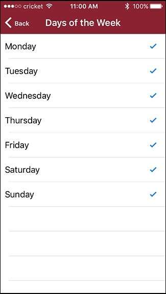 Standaard worden alle zeven dagen geselecteerd, maar u kunt kiezen welke dagen u wilt gebruiken. Druk op de terugknop als je klaar bent.