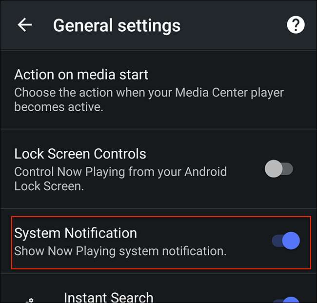 U kunt ook een doorlopende melding inschakelen in de menubalk van Android, vergelijkbaar met degene die door de meeste mediaspelers wordt gebruikt. Open in Yatse het zijmenu en tik op "Instellingen". Ga dan naar "Algemene instellingen" en schakel "Systeemmelding" in.