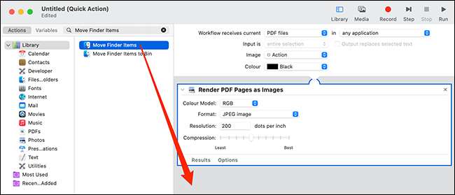Klik nogmaals op het zoekvak naast "Variabelen". Typ deze keer "Move Finder-items". Dank vervolgens vanuit de zoekresultaten "Move Finder Items" en laat u deze vallen onder de "Render PDF-pagina's als afbeeldingen" op de werkstroom aan de rechterkant.