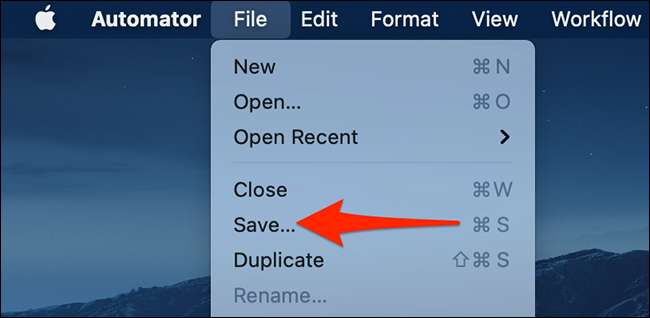 Uw snelle actie is nu klaar. Selecteer Bestand & GT om het op te slaan, in de menubalk van Automator Opslaan. Als alternatief drukt u op de sneltoets van de opdracht + S-toetsenbord.