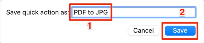 U ziet een opslagprompt in Automator. Hier typt u een naam voor uw snelle actie en klik op "Opslaan". Deze naam verschijnt wanneer u deze actie gebruikt, dus gebruik dus iets beschrijvend. We gaan met "PDF naar JPG".