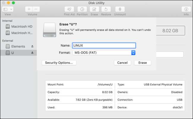 Start Schijfhulpprogramma (zoek ernaar Schijnwerpers , of vind het in de applicaties en GT; Map Utilities) en klik vervolgens op uw USB-station. Als u tevreden bent, kunt u de drive wissen zonder gegevens te verliezen, klikt u op "Wissen" en kiest u vervolgens "MS-DOS (FAT)" als het formaat en geef het een naam. Klik op Wissen en wacht tot het proces is voltooid.