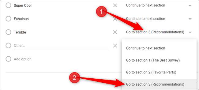 Klik vervolgens op een vraag om vertakkingslogica aan toe te voegen. Klik op Meer (drie puntjes) in de rechterbenedenhoek en klik vervolgens op 'Ga naar sectie op basis van antwoord'.