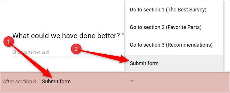 Wanneer u aan het einde van een logische keten komt, klikt u op het vervolgkeuzemenu onder aan de sectie en kiest u vervolgens "Formulier verzenden" uit de lijst met opties.