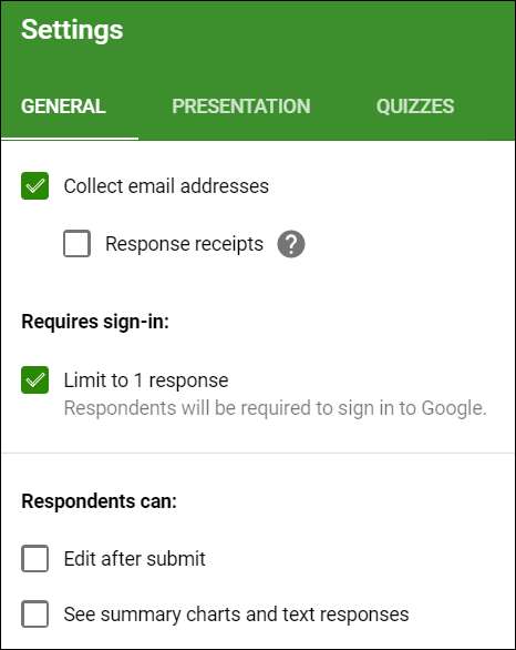 Het eerste tabblad heeft een aantal instellingen die u kunt inschakelen. Vanaf hier kunt u e-mailadressen verzamelen, een kopie van hun antwoorden via e-mail verzenden en elke persoon beperken tot één inzending. U kunt ook kiezen of respondenten hun antwoorden kunnen bewerken nadat ze zijn ingediend, of een overzichtstabel aan het einde van de enquête kunnen zien.