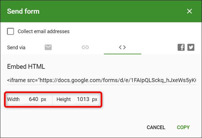 Als u de afmetingen van het formulier en hoe het op uw website wordt weergegeven, moet wijzigen, wijzigt u de breedte en hoogte onder de HTML-code voordat u op 'Kopiëren' klikt.