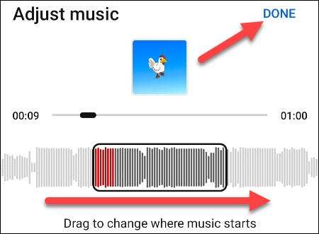 Het laatste om te doen is de muziek- en tekstpositie bewerken in de tijdlijn. Als u muziek heeft toegevoegd, tikt u op "Aanpassen".