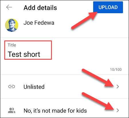 De laatste stappen zijn om de korte naam te geven, het zicht te kiezen en het publiek te selecteren. Zodra u klaar bent, tikt u op "Uploaden".