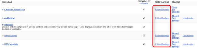 Uw agenda's worden hier vermeld, met aangepaste instellingen voor elk aan uit aan de rechterkant. Klik op "Meldingen bewerken" rechts van de agenda die u wilt wijzigen.
