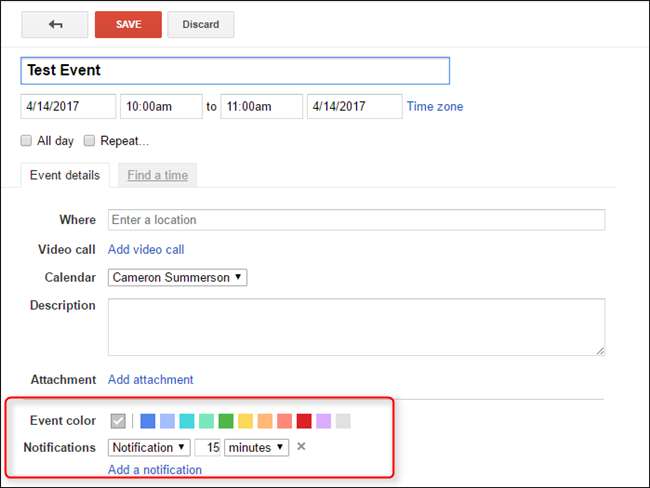 U kunt de kleur van de gebeurtenis wijzigen, evenals de meldingsinstellingen. Dit omvat ook het toevoegen of verwijderen van meldingen voor deze specifieke gebeurtenis.