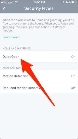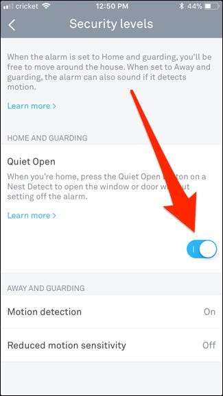 Nadat je op de "Quiet Open" -instelling hebt getikt, wordt dat gedeelte uitgevouwen en kun je op de tuimelschakelaar drukken om het in of uit te schakelen.