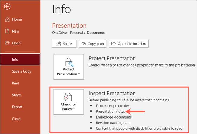 Klik op Bestand & GT; Info. Onder Inspecteer presentatie, zie je dat je diavoorstelling presentatienota's bevat.