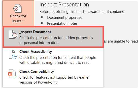 Klik op de vervolgkeuzelijst "Controleren op problemen" in dat gedeelte en selecteer vervolgens "Document inspecteren".