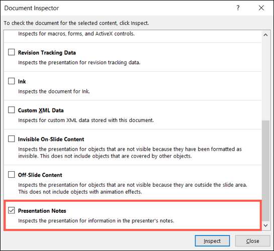 Voor deze taak controleert u alleen het vakje voor "Presentation Notes" onderaan en verwijdert u de rest. Wanneer u klaar bent, klikt u op "Inspecteren".