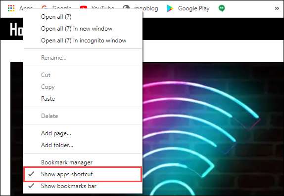 Klik vervolgens met de rechtermuisknop op overal op de knop Bookmarks of de "Apps" -knop zelf. Hiermee wordt een menu geopend, van waaruit u de snelkoppeling van de show apps-apps wilt verwijderen.