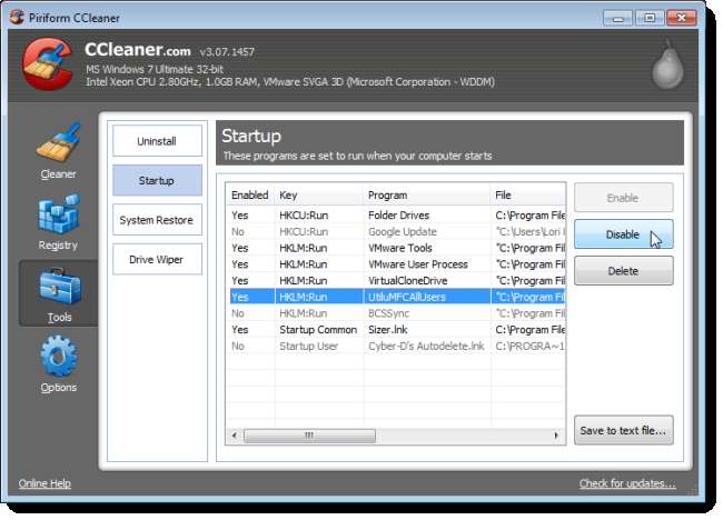 Het gratis hulpprogramma voor het opschonen van pc's CCleaner heeft ook een tool waarmee u opstartprogramma's kunt uitschakelen. Klik in CCleaner op de knop Extra aan de linkerkant van het dialoogvenster en klik op Opstarten om de lijst met opstartprogramma's te zien. De kolom Ingeschakeld geeft aan of elk programma is ingesteld om met Windows te starten. Om een programma dat is ingeschakeld uit te schakelen, selecteert u het programma in de lijst en klikt u op Uitschakelen. U kunt ook programma's inschakelen die zijn uitgeschakeld.