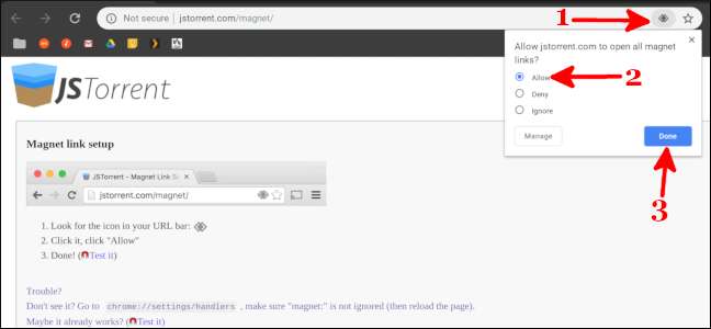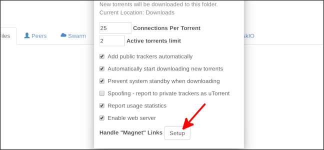 Vanaf hier kun je JSTorrent instellen om automatisch de Magnet-links te openen die doorgaans worden gebruikt om torrents te delen. Klik op "Setup" onder aan het instellingenscherm.
