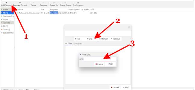 Je kunt de torrent ook downloaden via URL. Selecteer 'Torrent toevoegen' bovenaan en selecteer vervolgens 'URL'. Plak de URL en klik op 'OK'.