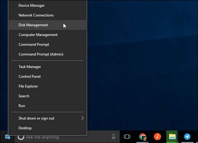 Om Schijfbeheer op Windows 8 of 10 te openen, klikt u met de rechtermuisknop op de Start-knop en selecteert u “Schijfbeheer”. Druk in Windows 7 op Windows + R om het dialoogvenster Uitvoeren te openen, typ