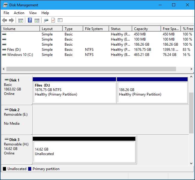Bekijk de lijst met schijven in het schijfbeheervenster en zoek naar uw externe schijf. Zelfs als het niet wordt weergegeven in Windows Verkenner, zou het hier moeten verschijnen. Zoek een schijf die overeenkomt met de grootte van uw flashstation. Soms wordt het ook gemarkeerd als 'Verwijderbaar', maar niet altijd.
