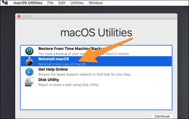 Selecteer op het welkomstscherm van de herstelmodus "MacOS opnieuw installeren", waardoor het installatieprogramma wordt geopend.