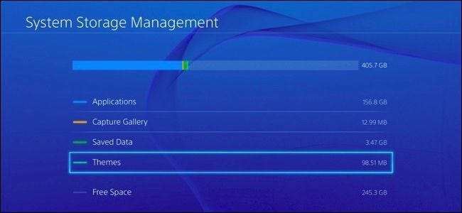 Ga naar Instellingen> Beheer van systeemopslag om precies te zien wat de ruimte op uw console gebruikt. U ziet precies hoeveel vrije ruimte u beschikbaar heeft en hoeveel gegevens worden gebruikt door applicaties, de opnamegalerij (die uw opgeslagen videoclips en schermafbeeldingen bevat), opgeslagen gegevens (zoals opgeslagen games) en thema's.