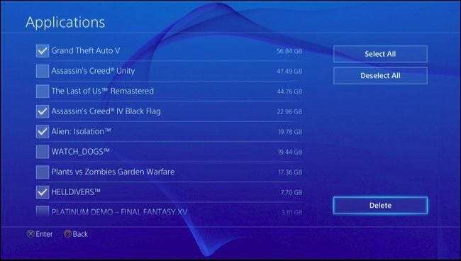 Om precies te zien hoeveel ruimte elke game inneemt, ga je naar Instellingen> Systeemopslagbeheer> Toepassingen. Om een of meer games te verwijderen, drukt u op de knop "Opties" op uw controller en selecteert u "Verwijderen". Selecteer de games die u wilt verwijderen en selecteer de knop "Verwijderen".