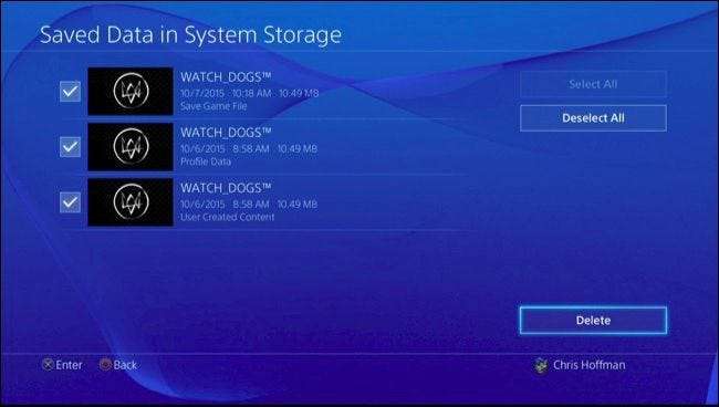 Als je de game in de toekomst niet meer speelt en je de opgeslagen gegevens niet interesseert, kun je deze gegevens van je console verwijderen om ruimte te besparen. Sommige games zijn niet goed geoptimaliseerd en hebben zeer grote opslagbestanden die u kunt verwijderen om een merkbare hoeveelheid ruimte vrij te maken. Om gegevens te verwijderen, selecteert u een spel in de lijst, selecteert u de opgeslagen spellen die u wilt verwijderen en selecteert u "Verwijderen".