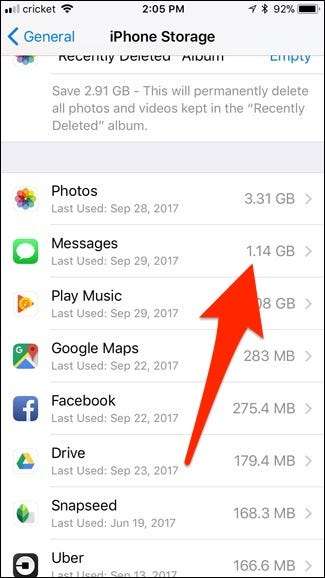 Blader vervolgens door de lijst en zoek naar de Berichten-app. U kunt zien hoeveel opslagruimte het in beslag neemt. In mijn geval neemt het 1,14 GB in beslag. Als de uwe veel ruimte in beslag neemt, lees dan verder om te zien hoe u deze kunt vrijmaken.
