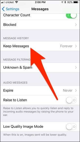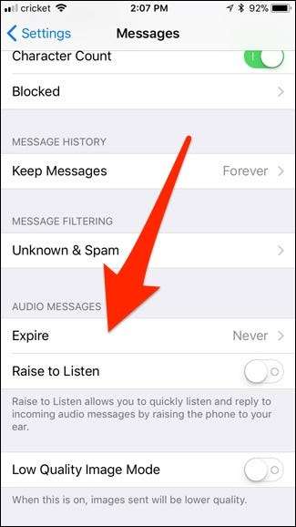 Wat audioberichten betreft, uw apparaat verwijdert deze automatisch twee minuten nadat u ernaar hebt geluisterd. Dit voorkomt dat ze voor altijd ruimte innemen, zelfs nadat u er helemaal klaar mee bent. Om dit te wijzigen, kunt u teruggaan naar het hoofdscherm Berichten in de instellingen en op "Verlopen" onder "Audioberichten" tikken.