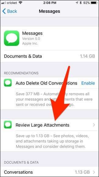 Ga in plaats daarvan terug naar de app Instellingen en navigeer naar Algemeen> iPhone-opslag (of iPad-opslag) zoals je eerder deed. Blader door de lijst en selecteer de Berichten-app. Tik vanaf daar op "Grote bijlagen beoordelen".