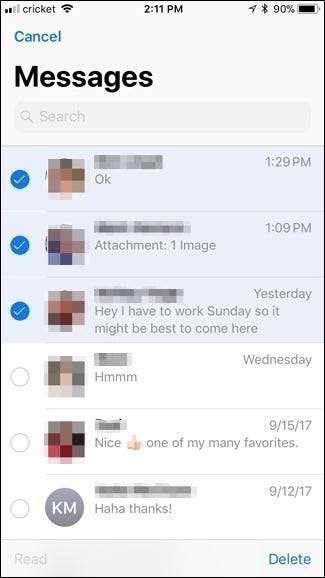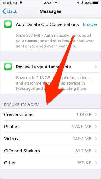 Als Berichten veel ruimte in beslag neemt, is het waarschijnlijk dat afbeeldingsbijlagen de schuld zijn, dus het simpelweg verwijderen van tekstconversaties helpt misschien niet genoeg. Als je echter lange gesprekken hebt vol met sms-berichten, nemen deze misschien wat meer ruimte in beslag dan je denkt. U kunt ze verwijderen en ruimte vrijmaken, ervan uitgaande dat u die gesprekken niet wilt bewaren.